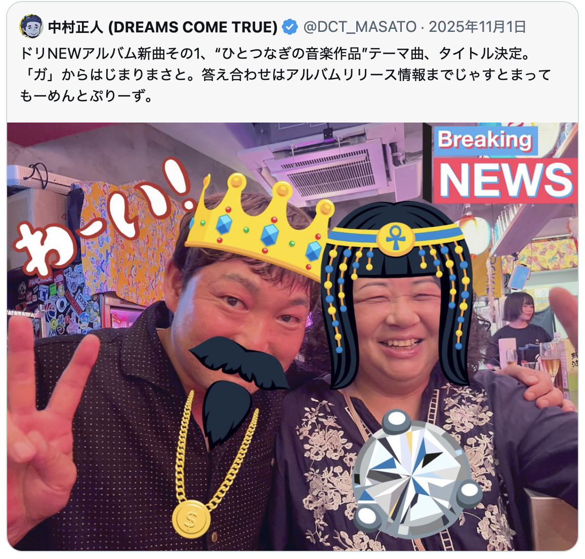 2026. 01.09 NEW 答え合わせII㊗️ X投稿 2025年11月1日 14:15 新曲その1、「ガ」からはじまるタイトルはもうお分かりですね。そうアルバムオープニング曲。英語で綴れるようにしといて下さい。これ試験に出ます。 前へ 一覧に戻る 次へ