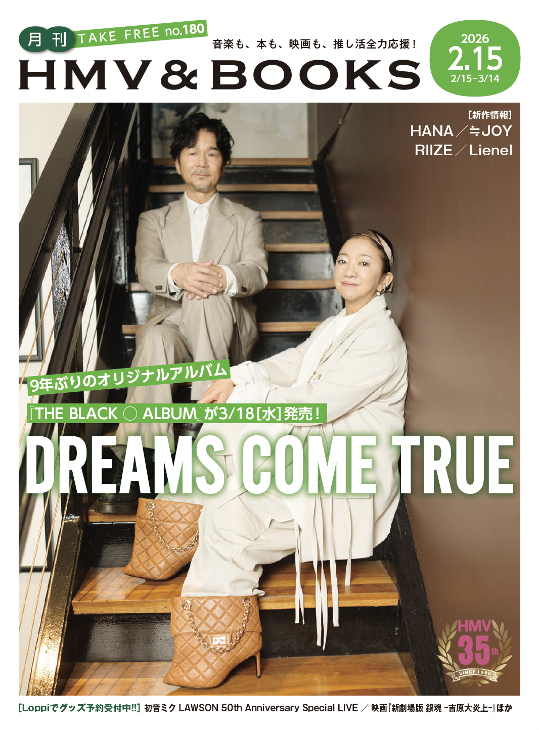 2026. 02.15 NEW 2月15日 (日) 発行 「月刊HMV & BOOKS」 2月15日 (日) 発行「月刊HMV & BOOKS」の表紙と中ページに DREAMS COME TRUEが登場! 中ページには、DREAMS COME TRUE NEWアルバム「THE BLACK ○ ALBUM」 特集ページが掲載されています。 是非、お近くのローソン店頭でチェックしてみてください。 前へ 一覧に戻る